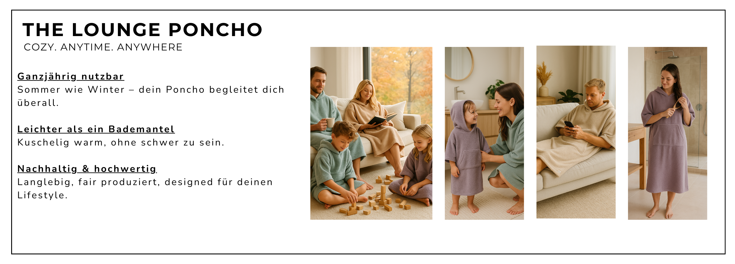 Unsere Ponchos sind keine Fast Fashion Produkte, sondern stilvolle Klassiker, die Dir über Jahre hinweg Freude und Komfort bereiten. Nicht kompliziert, sondern durchdacht. Nicht billig, sondern fair kalkuliert.
